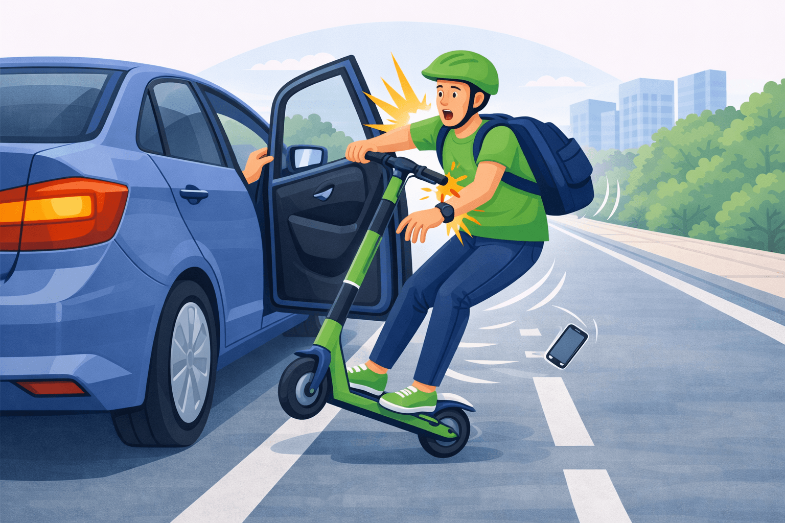 Dooring je situacija kada vozač ili putnik u parkiranom vozilu naglo otvori vrata, a vozač e-romobila nema dovoljno vremena da reaguje i dolazi do sudara.
