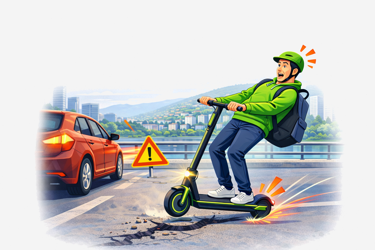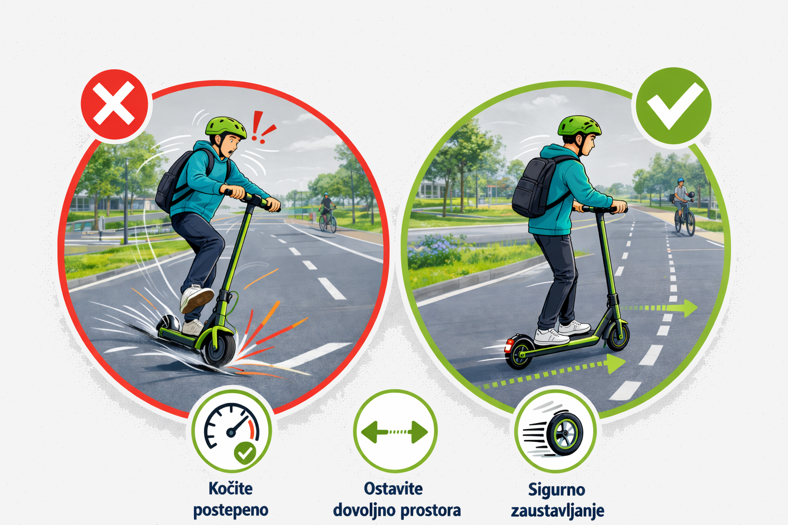 Vožnja e-romobila zahtijeva koncentraciju, kontrolu i smirenost. Nagle reakcije, panika ili nervoza mogu dovesti do pogrešnih odluka i povećati rizik od nezgode.