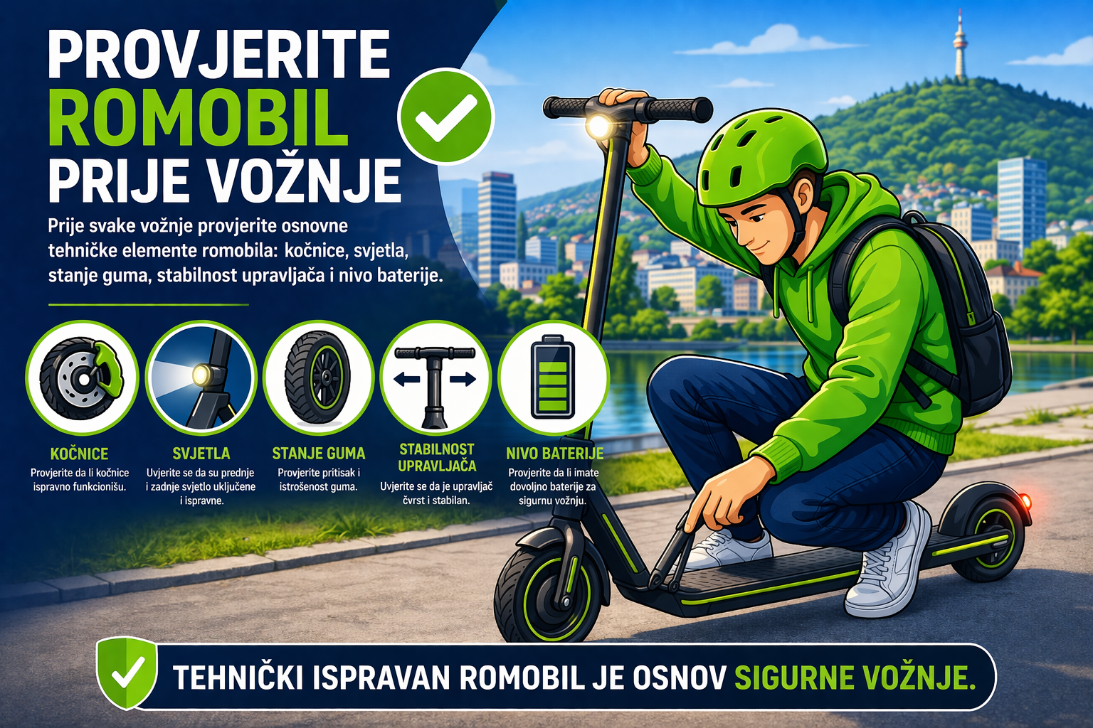 Prije svake vožnje provjerite osnovne tehničke elemente romobila: kočnice, svjetla, stanje guma, stabilnost upravljača i nivo baterije.
